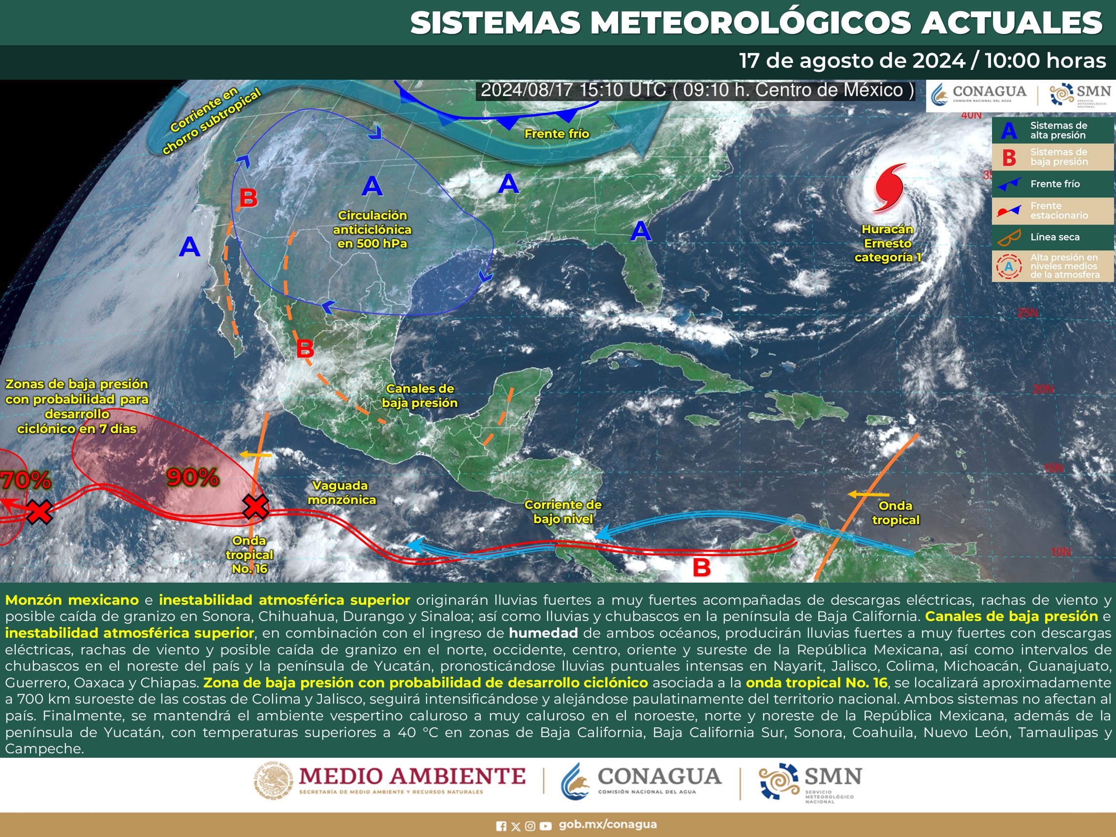 En el centro y sur del estado, se prevén lloviznas y lluvias menores, de 5.1 a 25 mm. Las lluvias serán, en general, vespertinas a nocturnas en las áreas montañosas y nocturnas a matutinas en las planicies y áreas costeras.