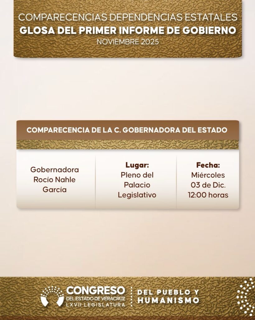 Xalapa, Veracruz, 7 de noviembre de 2025 – El Congreso del Estado de Veracruz, en su LXVII Legislatura, dio a conocer este jueves el calendario detallado de comparecencias de las dependencias estatales como parte de la glosa al Primer Informe de Gobierno de la gobernadora Rocío Nahle García. Este ejercicio de rendición de cuentas, aprobado por el Pleno la víspera, se llevará a cabo del 18 al 28 de noviembre en el Auditorio Sebastián Lerdo de Tejada, con el objetivo de analizar el estado que guarda la administración pública estatal.
