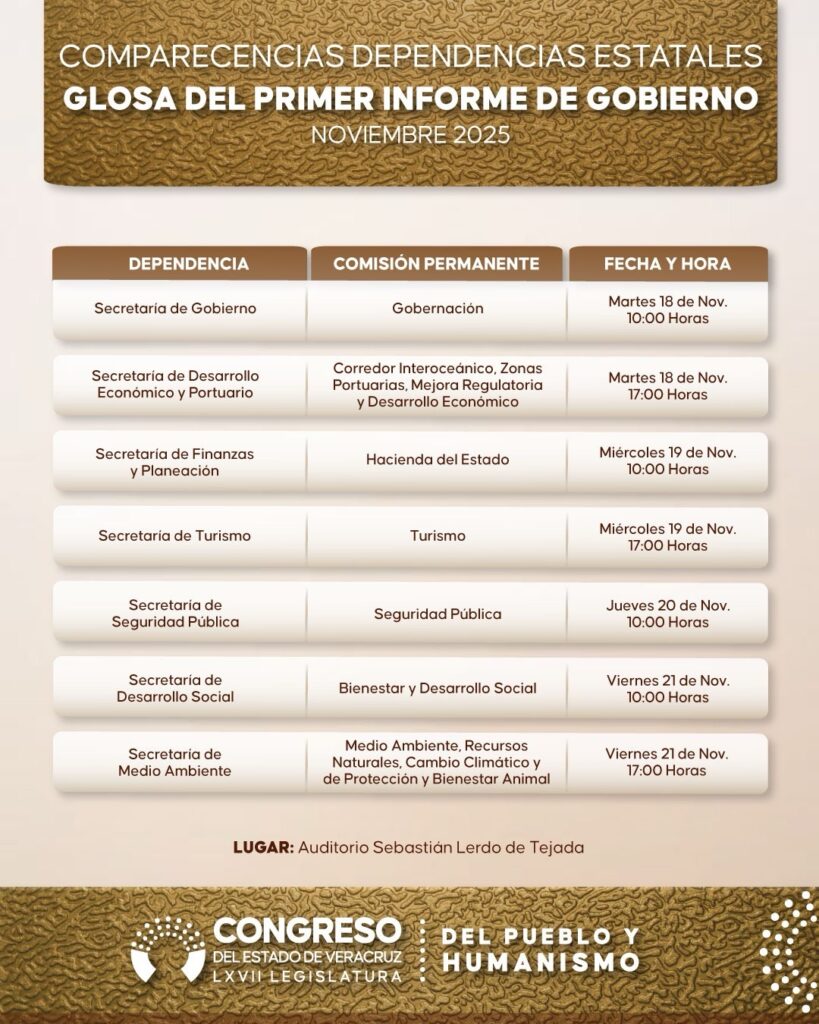 El cronograma inicia el martes 18 de noviembre a las 10:00 horas con la comparecencia de la Secretaría de Gobierno ante la Comisión de Gobernación. Ese mismo día, a las 17:00 horas, acudirá la Secretaría de Desarrollo Económico y Portuario (Sedecop) ante la Comisión Permanente de Corredor Interoceánico, Zonas Portuarias, Mejora Regulatoria y Desarrollo Económico. El miércoles 19, la Secretaría de Finanzas y Planeación se presentará a las 10:00 horas en la Comisión de Hacienda del Estado, seguida de la Secretaría de Turismo a las 17:00 horas en la Comisión de Turismo.