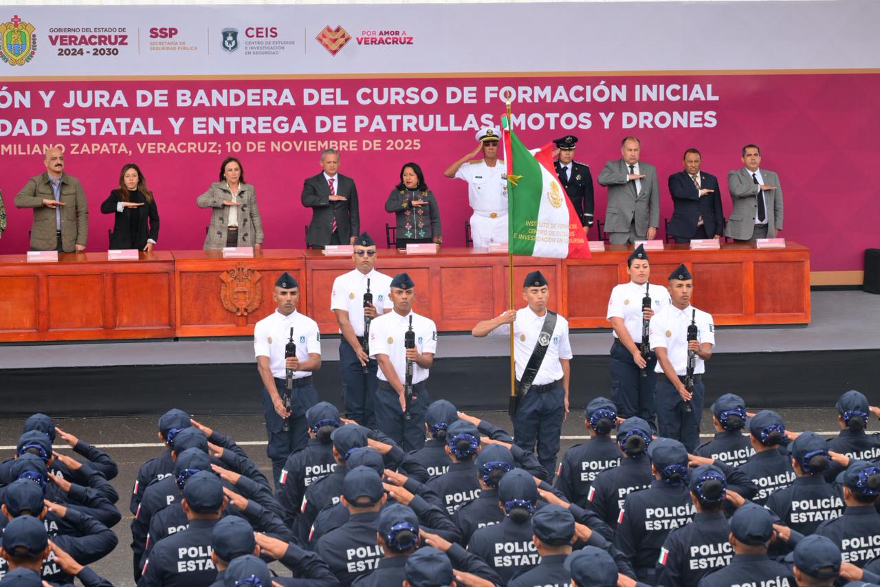 Xalapa, Ver., 10 de noviembre de 2025.- En representación de la LXVII Legislatura del Estado de Veracruz, la presidenta de la Mesa Directiva, diputada Naomi Edith Gómez Santos, acudió a la Ceremonia de Graduación y Jura de Bandera del Curso de Formación Inicial para Policía de Proximidad Estatal y Entrega de Patrullas, Motos y Drones, encabezada por la gobernadora de Veracruz, Rocío Nahle García. La inversión, que supera los 200 millones de pesos, fortalece las capacidades operativas de la fuerza policial e impulsa la Estrategia Estatal de Seguridad para mantener la paz en Veracruz.